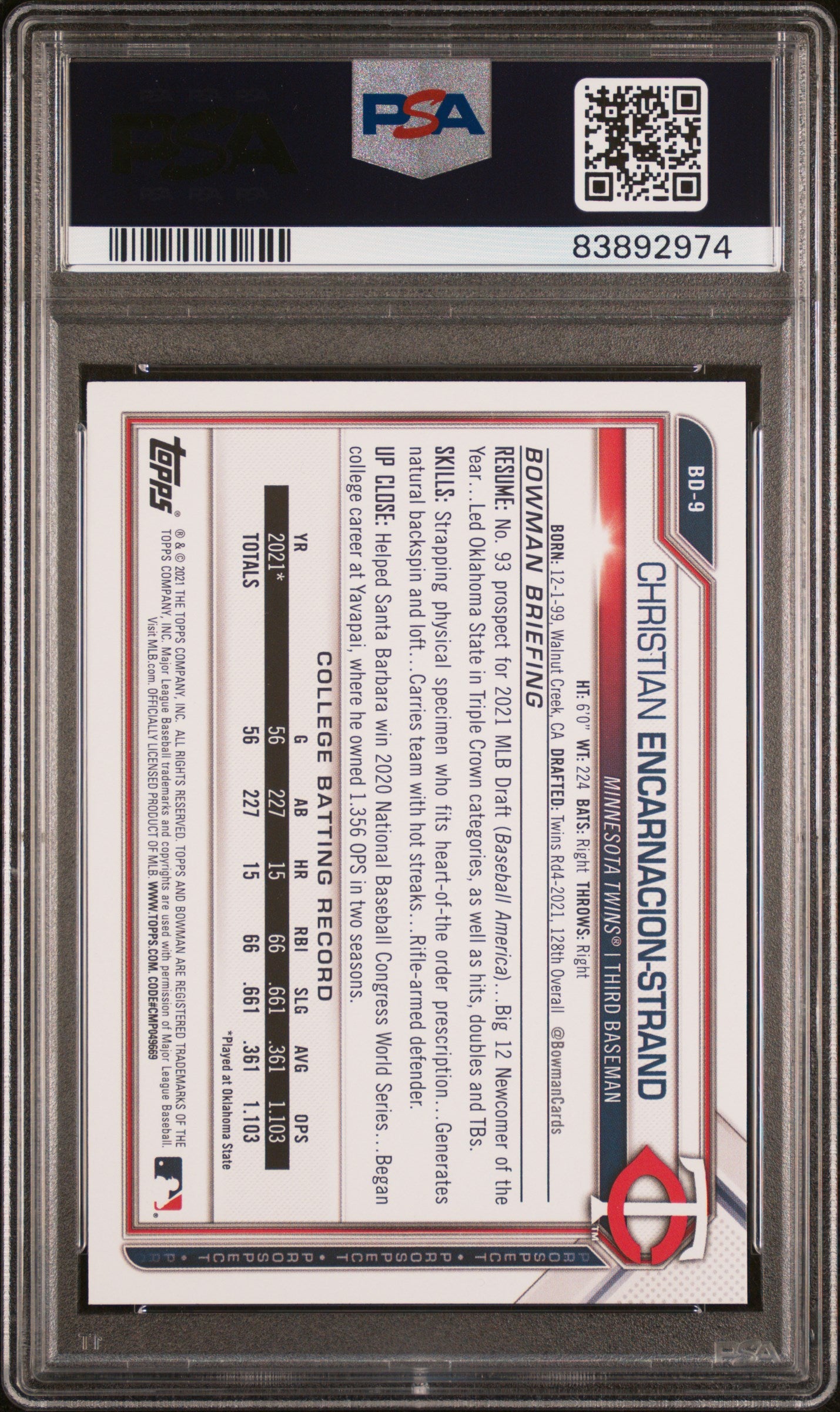 You are purchasing a PSA 10 2021 Bowman Draft C. Encarnacion-Strand #BD9. You will receive the exact item in the... Read more
