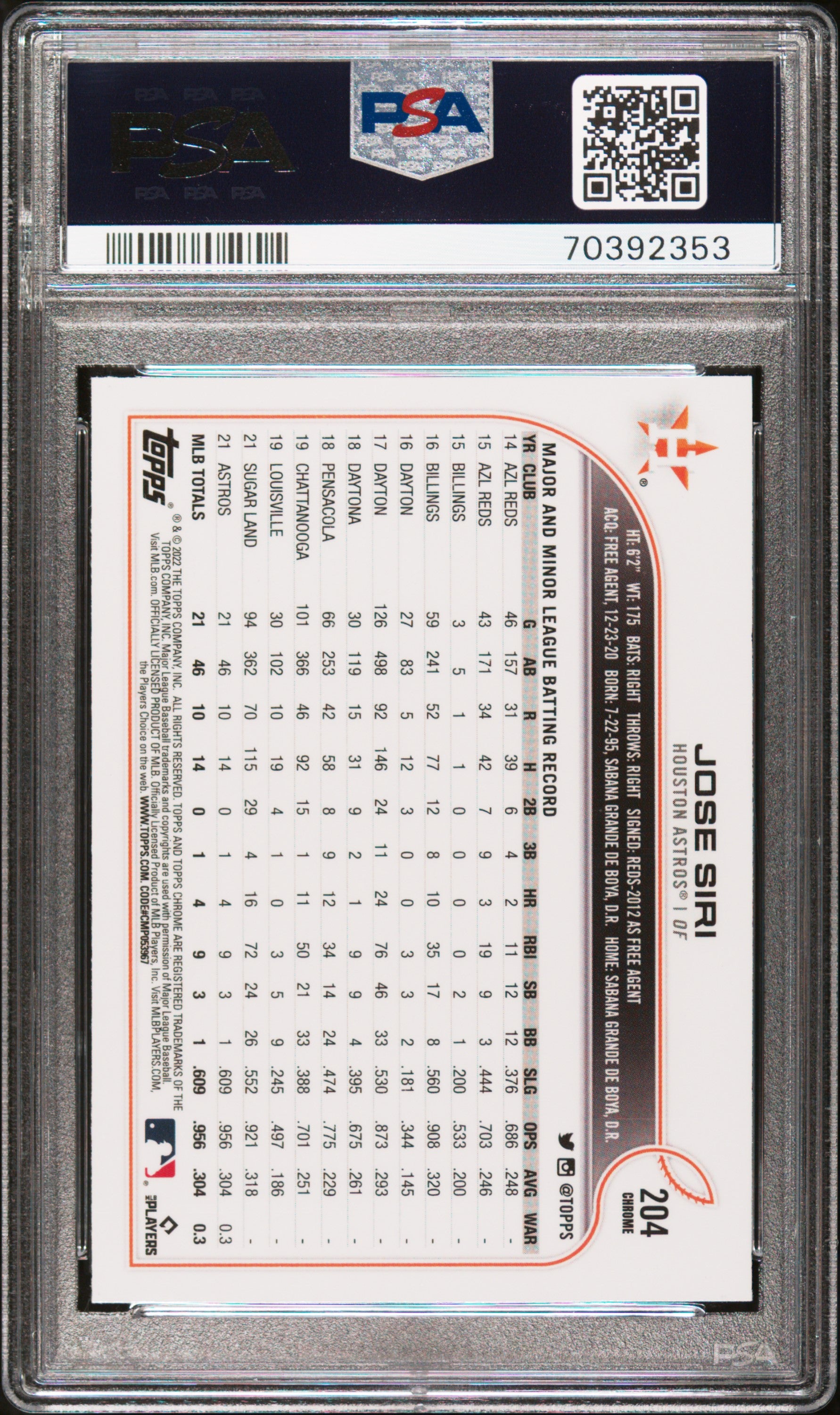 You are purchasing a PSA 10 2022 Topps Chrome Jose Siri #204. You will receive the exact item in the... Read more