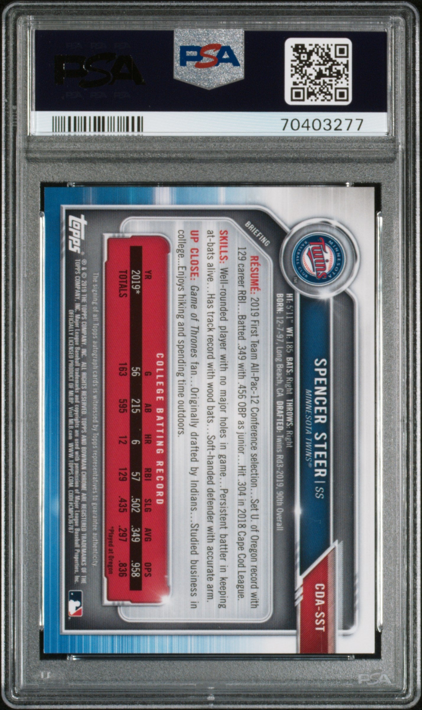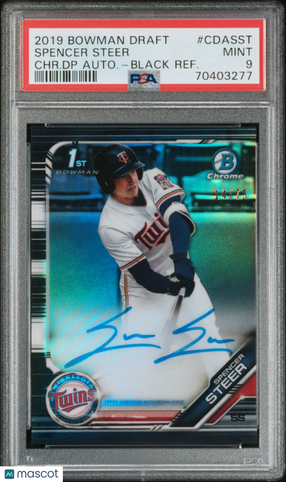 You are purchasing a PSA 9 2019 Bowman Draft Chrome Draft Picks Autograph Spencer Steer #CDASST 14/75 CHR. DP Autograph... Read more